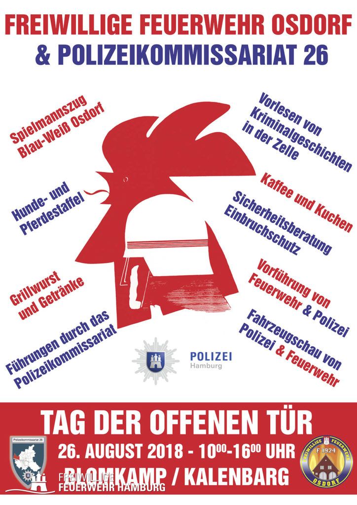 Am Sonntag, den 26.08.2017 von 10-16 Uhr öffnen in diesem Jahr die Freiwillige Feuerwehr Osdorf und die Polizei Osdorf (PK 26) wieder einmal gemeinsam ihre Häuser am Blomkamp,Ecke Kalenbarg für alle Bürger/-innen und natürlich den Nachwuchs für den Tag der offenen Tür. Gezeigt werden u.a. die Einsatzfahrzeuge von Polizei und Feuerwehr, Einsatzübungen, Pferdestaffel und Streifen-Krad. Neben den Einsatzübungen von Polizei und Feuerwehr ist für das leibliche Wohl aller Gäste durch unsere Grillmeister und Erfrischungsgetränke gesorgt. Außerdem haben die Feuerwehrfrauen wieder ein reichhaltiges Kuchenbuffet im Angebot. Wir freuen uns auf Sie! Veranstalter ist der Förderverein der FF Osdorf.