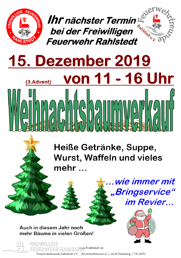 Am 15. Dezember von 11 bis 16 Uhr steht der alljährliche Weihnachtsbaumverkauf der Freiwilligen Feuerwehr Rahlstedt an. Natürlich bieten wir neben wunderschönen Weihnachtsbäumen in unterschiedlichen Größen auch allerlei leckere Versorgungsmöglichkeiten für  unsere Besucher (unter anderem Waffeln, Wurst, Suppe und Getränke). Ihren Weihnachtsbaum liefern wir im Revier wie gewohnt bis vor Ihre Haustür.