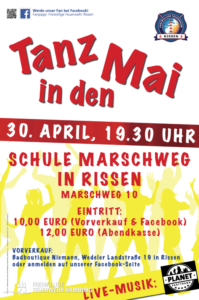 Die Freiwillige Feuerwehr Rissen feiert wieder und lädt alle Partybegeisterten herzlich zum Rissener Tanz in den Mai ein. Am Sonntag, dem 30. April findet die Feier ab 19.30 Uhr traditionell in der Mehrzweckhalle der Schule Marschweg, Marschweg 10, statt. Die Ausrichter freuen sich auch besonders über viele Gäste aus anderen Freiwilligen Feuerwehren zum Klönen und Feiern.
