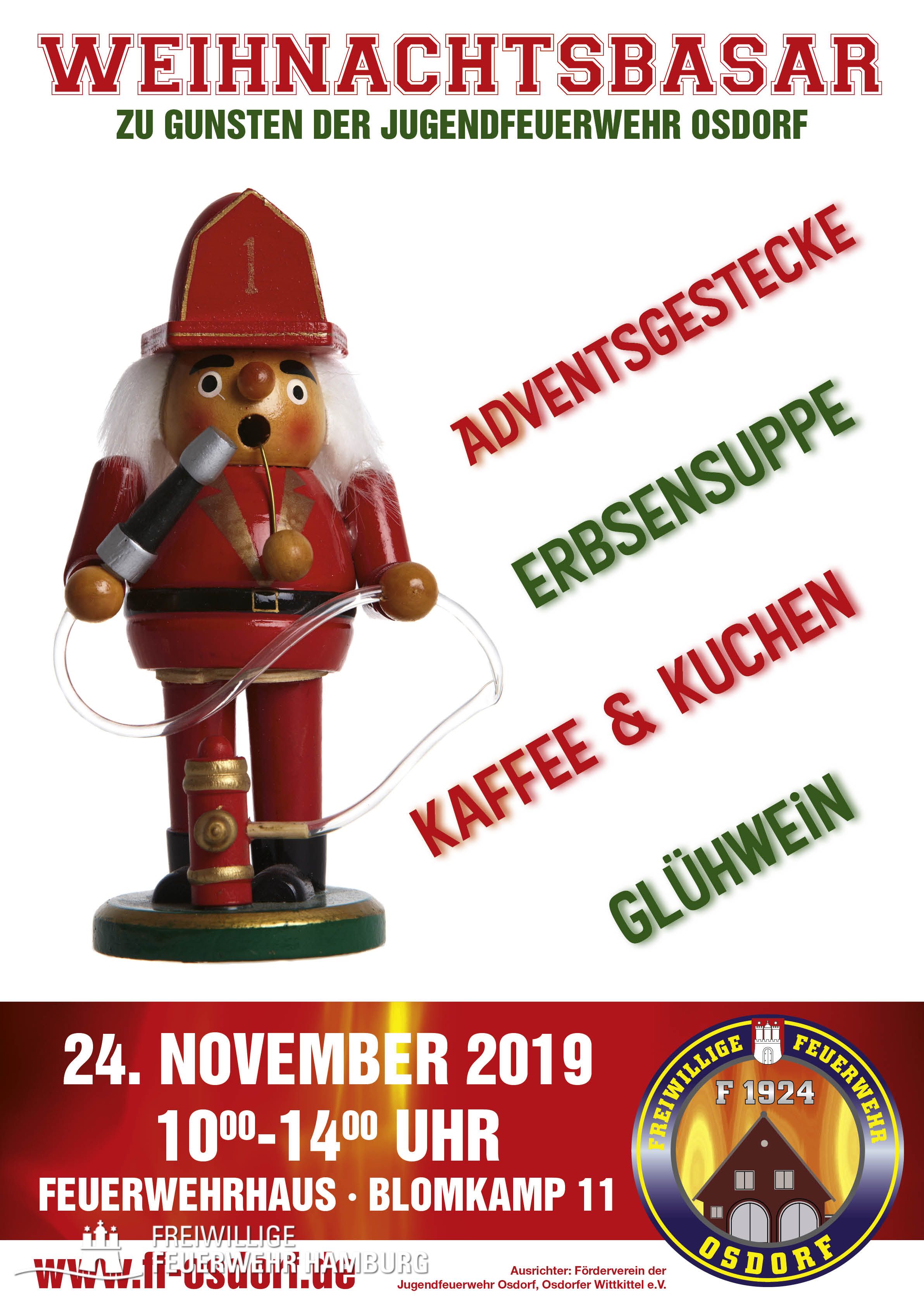 Am Sonntag, d. 24.11.2019, findet in der Zeit von 10-14 Uhr nun bereits zum sechzehnten Mal der weihnachtliche Basar der Jugendfeuerwehr Osdorf statt. Veranstaltungsort ist das Feuerwehrhaus der FF Osdorf am Blomkamp 11. Die Frauen und Mütter der Wehr- und JF-Mitglieder haben wieder kräftig gebastelt und so werden wie in den vergangenen Jahren Weihnachtsschmuck und Adventskränze angeboten. Vielleicht kann man dort noch ein vorweihnachtliches Geschenk oder Schmuckstückfinden. Zur Stärkung werden Kaffee und selbst gebackenen Kuchen angeboten, ebenso wie der bekannte Eintopf aus der Gulaschkanone der FF. Je nach Witterung gibt es außerdem wärmende Getränke. Der Veranstalter, der Förderverein der Jugendfeuerwehr Osdorf, "Osdorfer Wittkittel e.V.", und die Mitglieder der JF Osdorf freuen sich auf Ihr Kommen.