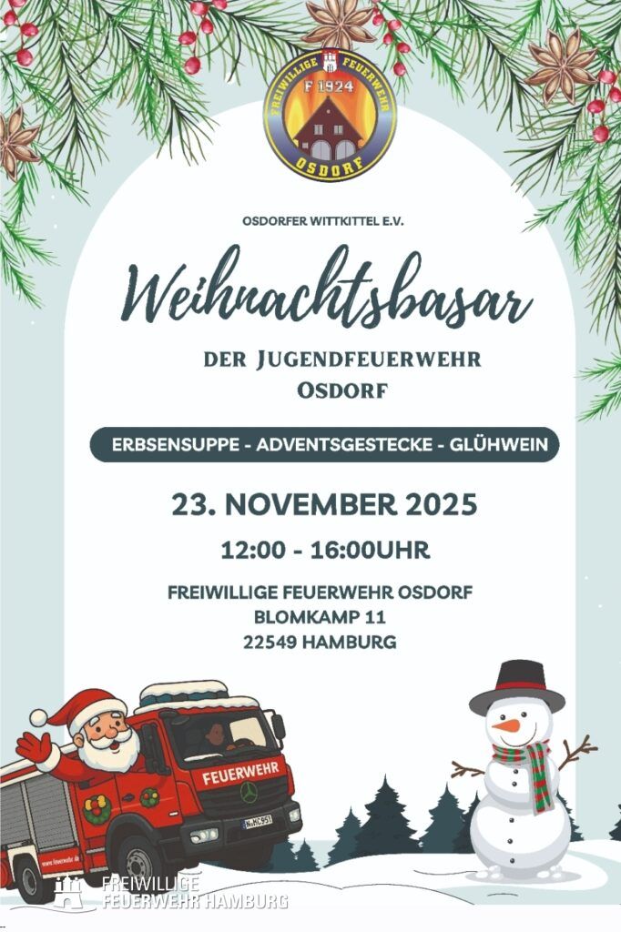 Am Sonntag, den 23.11.2025 von 12-16 Uhr findet zum nun bereits acht- zehnten Mal der weihnachtliche Basar der Jugendfeuerwehr Osdorf statt. Veranstaltungsort ist das Feuerwehrhaus der FF Osdorf am Blomkamp 11. Die Angehörigen der Jugendfeuerwehr sowie Wehrmitglieder und Eltern- teile haben wieder kräftig gebastelt und so werden wie in den vergan- genen Jahren Weihnachtsschmuck und Adventskränze angeboten. Bestimmt kann man dort ein vorweihnachtliches Geschenk oder Schmuck- stück für die Adventszeit finden. Zur Stärkung werden die bekannte selbstgekochte frische Erbsensuppe aus der Gulaschkanone der FF angeboten sowie weitere kleine Leckereien. Je nach Witterung gibt es außerdem wärmende Getränke wie z.B. Glüh- wein/Kakao. Stockbrot und Feuertonne sind auch wieder geplant. Der Veranstalter, der Förderverein der Jugendfeuerwehr Osdorf, "Osdorfer Wittkittel e.V.", und die Mitglieder der JF Osdorf freuen sich auf Ihr Kommen!