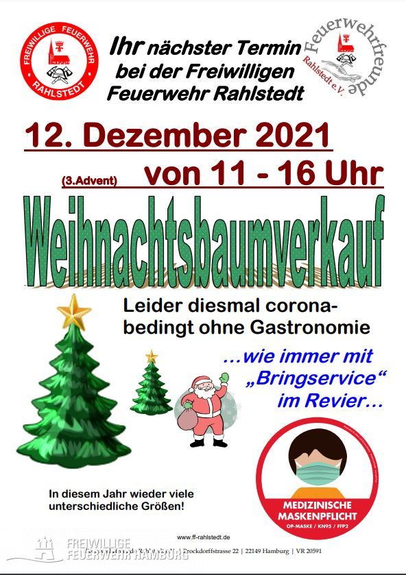 Die Freiwillige Feuerwehr Rahlstedt und der Förderverein der Feuerwehrfreunde Rahlstedt e.V. veranstalten in diesem Jahr wieder Ihren großartigen Tannbaumverkauf. Sie sind herzlich eingeladen sich Ihren Weihnachtsbaum am 3. Advent (12. Dezember) unter vielen schönen Bäumen auszusuchen.