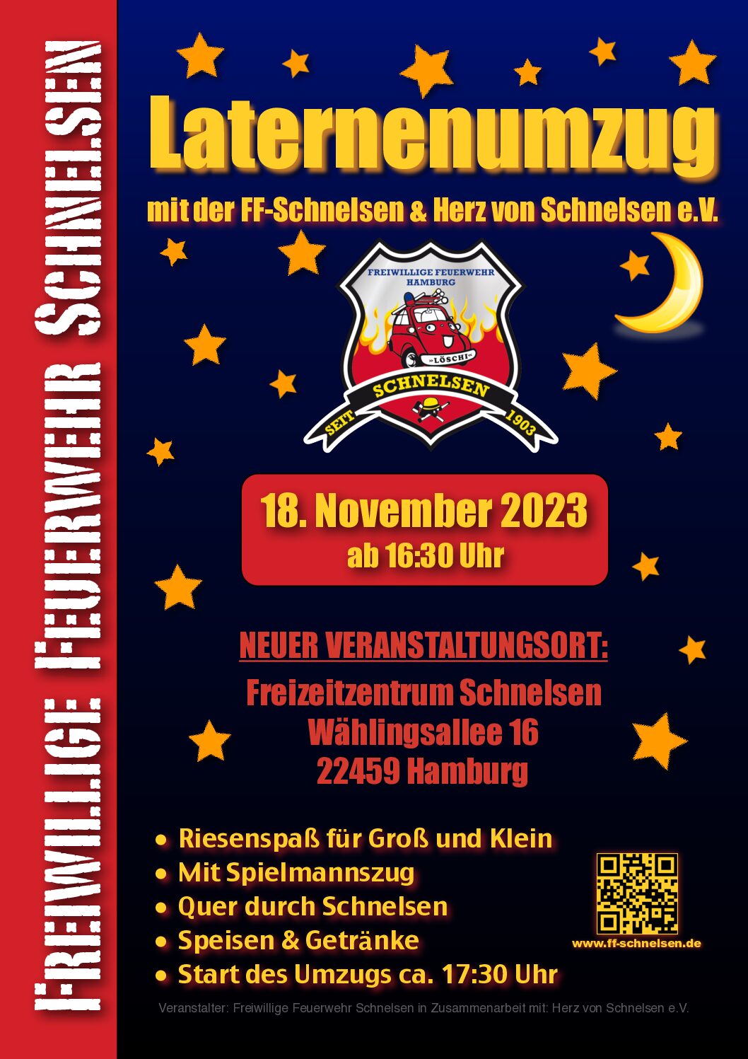 Am 18. November 2023 findet der diesjährige Laternenumzug der FF Schnelsen in Zusammenarbeit mit Herz von Schnelsen e.V. statt. Wie immer wird der Umzug von einem Spielmannszug angeführt und marschiert quer durch Schnelsen. Anders als bisher findet die Veranstaltung nicht am Feuerwehrhaus der Freiwilligen Feuerwehr Schnelsen statt, sondern am Freizeitzentrum Schnelsen (Wählingsallee 16, 22459 Hamburg).