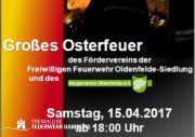 Am Ostersamtag des 15. April 2017 möchten wir, der Förderverein der Freiwillige Feuerwehr Oldenfelde-Siedlung und der Bürgerverein Oldenfelde, Sie wieder herzlich zu unserem traditionellen Osterfeuer im Hanni Park einladen.