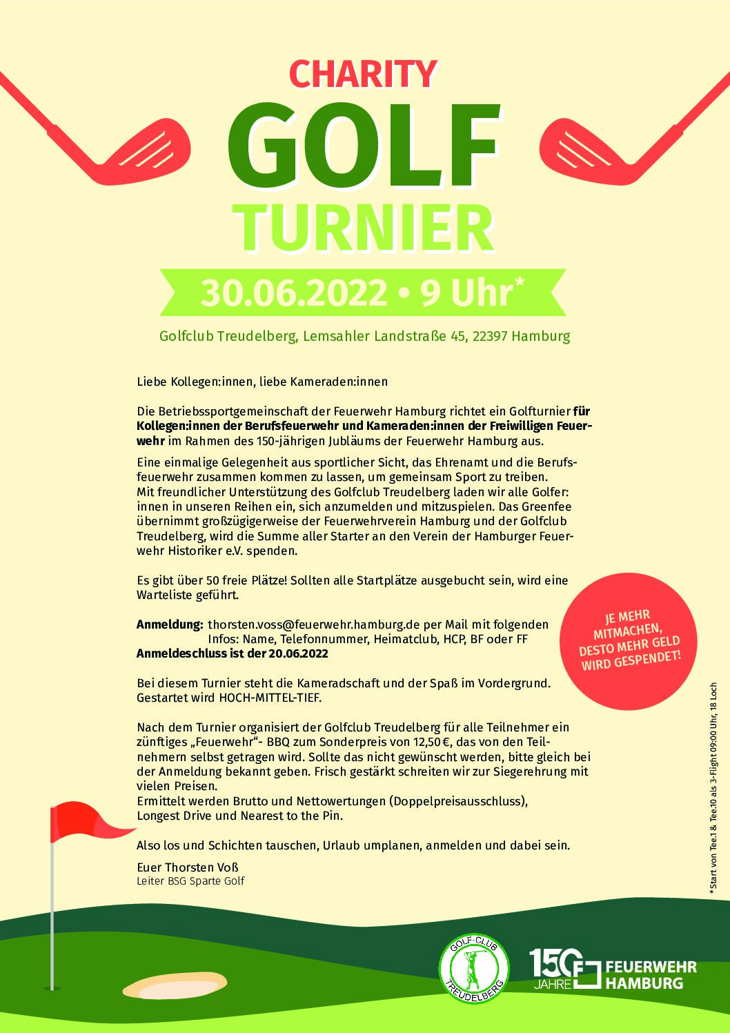 Im Rahmen des 150-jährigen Jubläums der Feuerwehr Hamburg richtet die Betriebssportgemeinschaft der Feuerwehr Hamburg ein Golfturnier für Kollegeninnen und Kollegen der Berufsfeuerwehr sowie für Kameradeninnen und Kameraden der Freiwilligen Feuerwehr aus. Anmeldung: [email protected] per Mail mit folgenden Infos: Name, Telefonnummer, Heimatclub, HCP, BF oder FF Anmeldeschluss ist der 20.06.2022